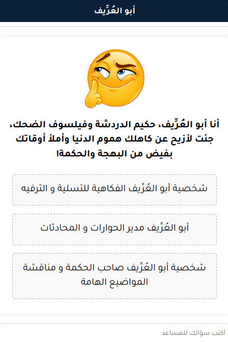 يسر منتدى الذكاء الاصطناعي www.mohtrainer.com/ai أن يعلن عن انضمام العضو الجديد **"أبو العُرِّيف"** إلى جيش المساعدين الأذكياء، ليقدم لكم تجربة فريدة تجمع بين العمق والمرح في آن واحد!