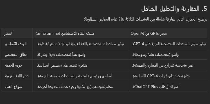 منتدى الذكاء الاصطناعي مقابل متجر GPTs: يتفوق المنتدى في التركيز اللغوي والثقافي على المستخدم العربي، وفي عمق التخصصات النادرة. بينما يتفوق متجر GPTs في قوة النموذج الأساسي (GPT-4) ومرونة إنشاء المساعدات. يواجه كلاهما تحديات في جودة المحتوى، حيث يعاني متجر GPTs من الازدحام، ويعتمد المنتدى على دقة المساعدات المتخصصة.