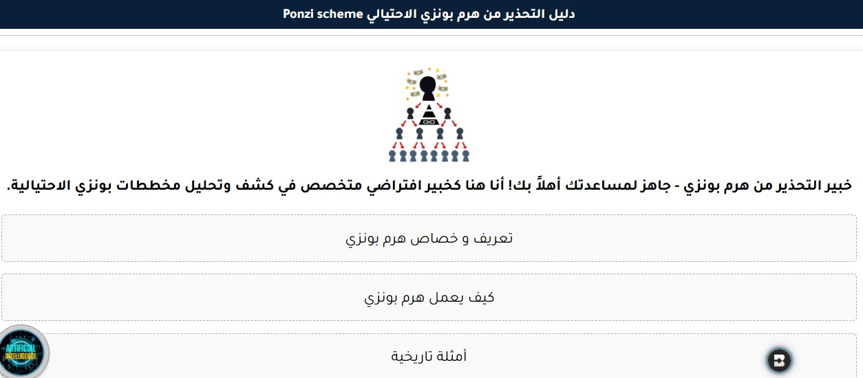 في ظل الانتشار الكبير للعروض الاستثمارية عبر الإنترنت ووسائل التواصل الاجتماعي، أصبحت الحاجة إلى وعي مالي حقيقي أكثر إلحاحاً من أي وقت مضى. تظهر مشاريع وهمية تلوح بأرباح خيالية، مستغلة أحلام الناس بالثراء السريع، لتقع بهم في فخ مخططات بونزي الاحتيالية المدمرة. هنا يبرز دور المساعد الذكي "دليل التحذير من هرم بونزي الاحتيالي"، وهو أحد الأعضاء المميزين في جيش المساعدين الأذكياء، ليكون المنارة التي تنير الطريق وتكشف المخاطر الخفية.