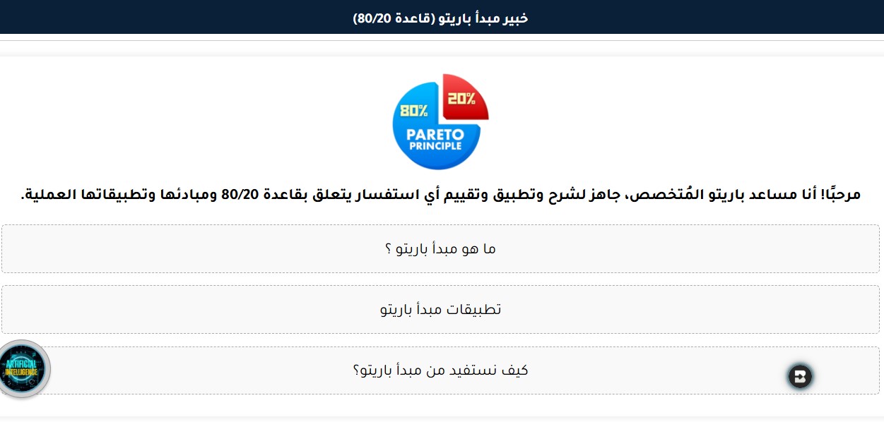 في عالم يتسارع فيه وتيرة الحياة وتتزاحم فيه المهام، يبرز الحاجة إلى أدوات ذكية تساعدنا على التركيز على الجوهري. هنا يأتي دور "خبير مبدأ باريتو (قاعدة 80/20)"، أحد أعضاء جيش المساعدين الأذكياء المتميزين، الذي صُمم خصيصًا ليكون دليلك الشخصي نحو الكفاءة والإنتاجية الاستثنائية.