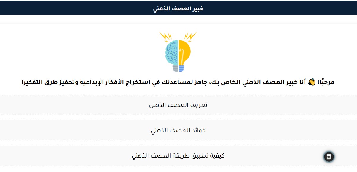 يعمل خبير العصف الذهني وفق آليات ذكية تحاكي أفضل ممارسات جلسات العصف الذهني الجماعية، لكن مع مزايا التقنية. فهو يتجنب الانحيازات الفردية، ويقاوم الجمود الفكري، ويشجع على الخروج عن المألوف بثبات. يمكنه مساعدتك في تنظيم أفكارك بشكل هرمي، أو إنشاء خرائط ذهنية متشعبة، أو حتى اقتراح منهجيات تفكير مناسبة لنوع التحدي الذي بين يديك.