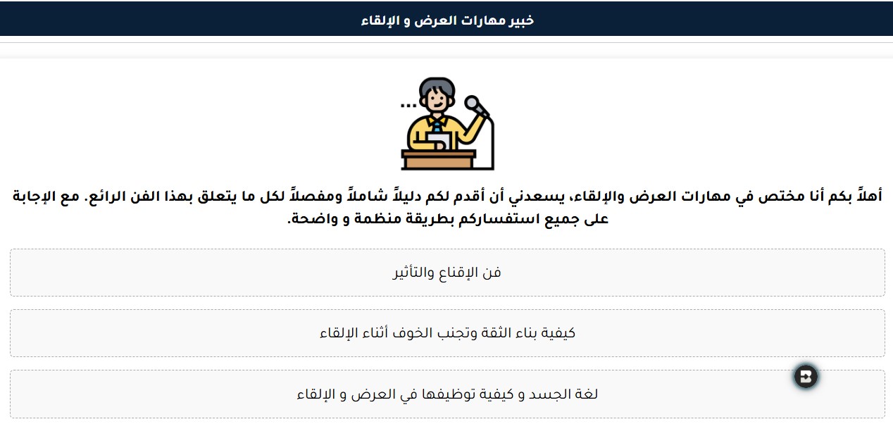 تخيل وجود مدرب شخصي محترف، متخصص في فنون الإلقاء والتقديم، يجلس معك في أي وقت تشاء، يحلل أداءك بدقة، ويقدم لك ملاحظات فورية لتحويل خطابك من جيد إلى ممتاز. هذا ليس حلماً للمستقبل، بل هو واقع ملموس مع المساعد الذكي "خبير مهارات العرض و الإلقاء"، أحد أبرز أعضاء جيش المساعدين الأذكياء الذي أطلقه منتدى الذكاء الاصطناعي لخدمة المجتمع العربي.