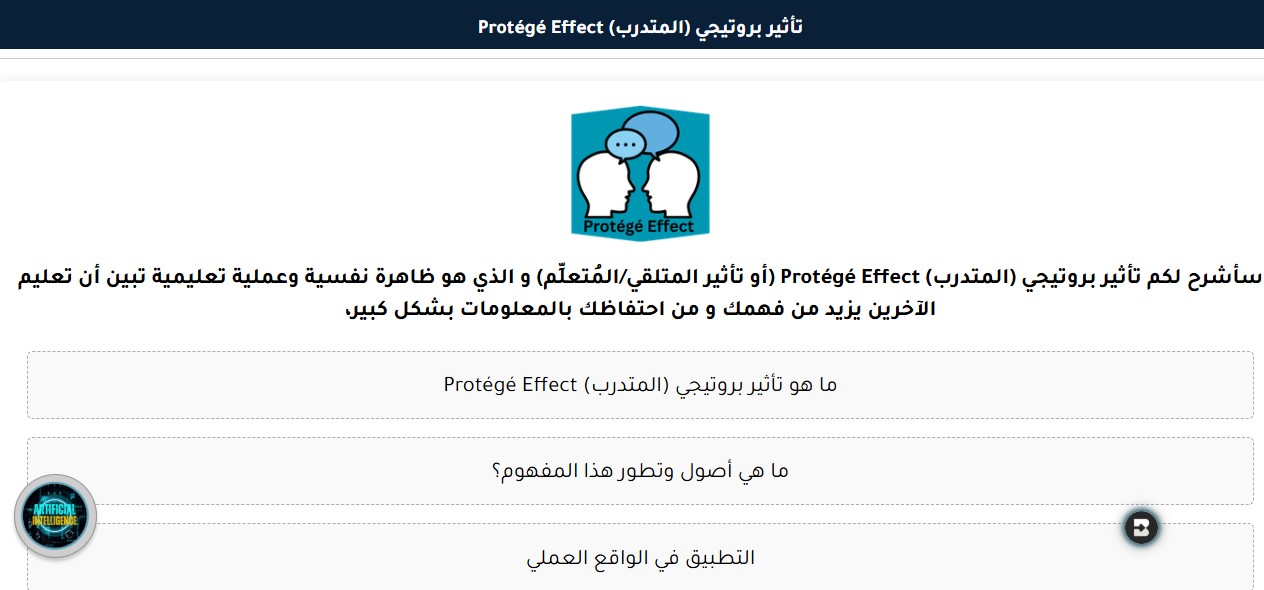 فكرة عمل هذا المساعد تستند إلى بحوث تربوية رصينة تثبت أن عملية الشرح تعزز المعالجة المعرفية. عندما تحاول تعليم مساعد ذكي، حتى لو كان برمجيا، فإنك تجبر عقلك على الانتقال من الفهم السطحي إلى الإتقان العميق. هذا بالضبط ما يوفره هذا العضو المميز في جيش المساعدين الأذكياء، حيث يصبح التعلم نشاطا تفاعليا ومستمرا.