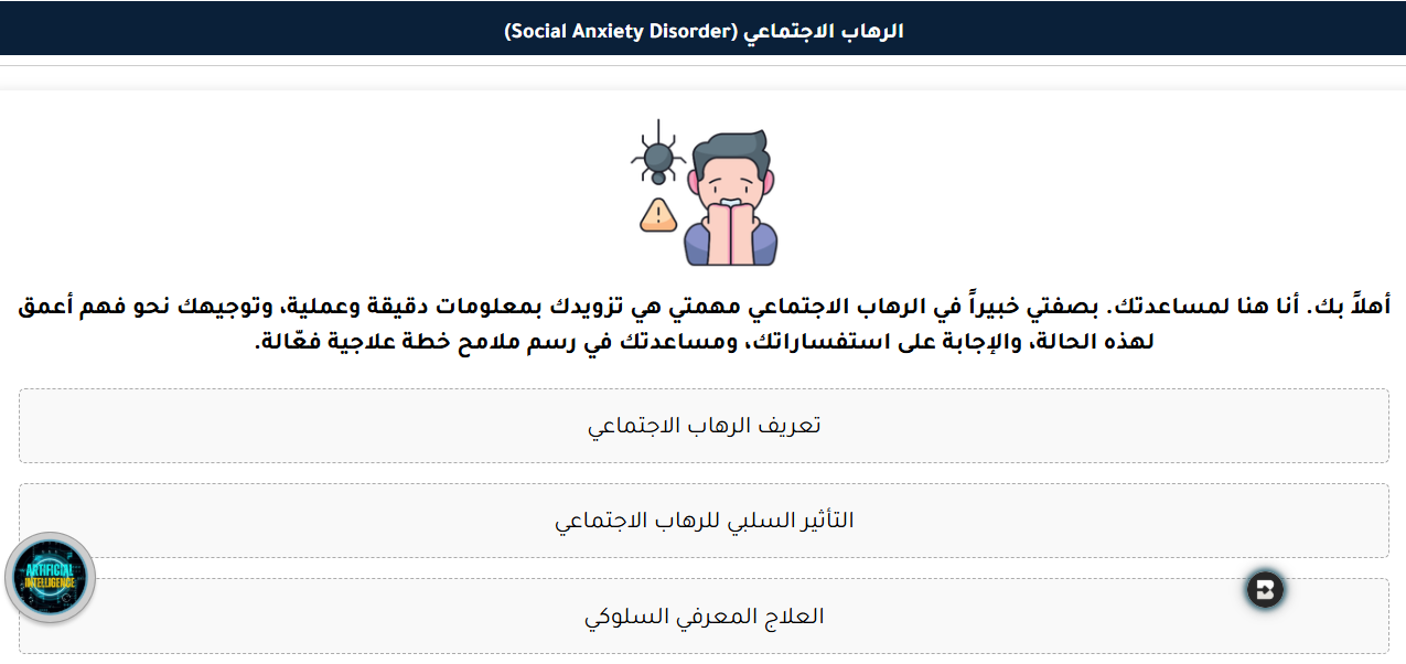يعمل هذا المساعد الذكي كمرجعية آمنة ومتاحة على مدار الساعة، يقدم معلومات موثقة عن طبيعة الرهاب الاجتماعي، وأعراضه الجسدية والنفسية، والاستراتيجيات المعرفية والسلوكية التي يمكن تطبيقها. من خلال محادثات تفاعلية، يساعد المستخدم على تحديد المواقف التي تثير قلقه، ويمنحه مساحة لممارسة مهارات المواجهة في بيئة خالية من الأحكام، مما يبني ثقته تدريجيا قبل خوض التجارب الواقعية.