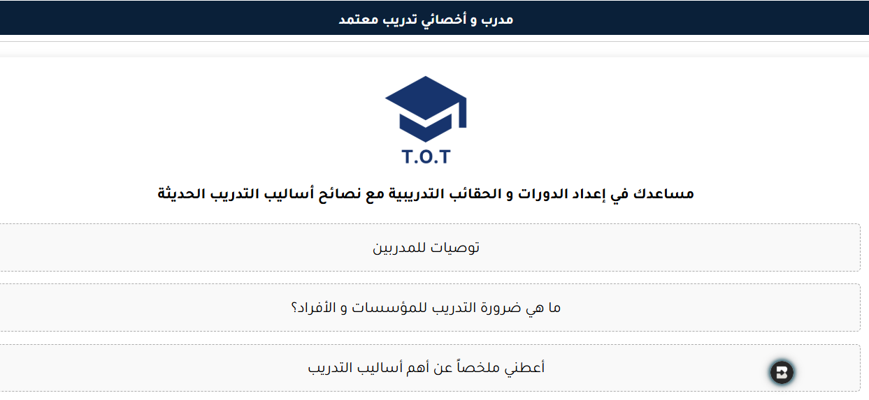 ما يميز "مدرب" هو تركيزه العملي على مجال التدريب والتطوير. فهو لا يقدم معلومات عامة فحسب، بل يصمم خططًا تعليمية مخصصة، يقترح موارد للتعلم، ويقدم إرشادات حول منهجيات التدريب الفعالة. سواء كنت مديرًا تسعى لرفع كفاءة فريقك، أو مدربًا مبتدئًا تبحث عن تأهيل احترافي، أو فردًا عاديًا يطمح إلى تطوير مهاراته الشخصية، فإن هذا المساعد قادر على تخطيط مسارك خطوة بخطوة.