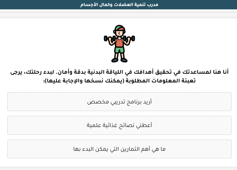 يمتلك هذا المساعد الذكي قاعدة معرفية شاملة تشمل أحدث الدراسات العلمية في مجال بناء العضلات والتغذية الرياضية وخطط التدريب المتخصصة. يتميز بقدرته على تصميم برامج تدريبية شخصية تناسب كل مستخدم حسب مستوى لياقته البدنية وأهدافه المحددة.