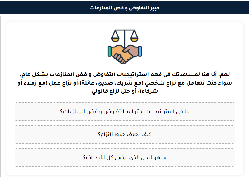 خبير التفاوض وفض المنازعات: رفيقك الذكي نحو حلول ناجحة وحكيمة