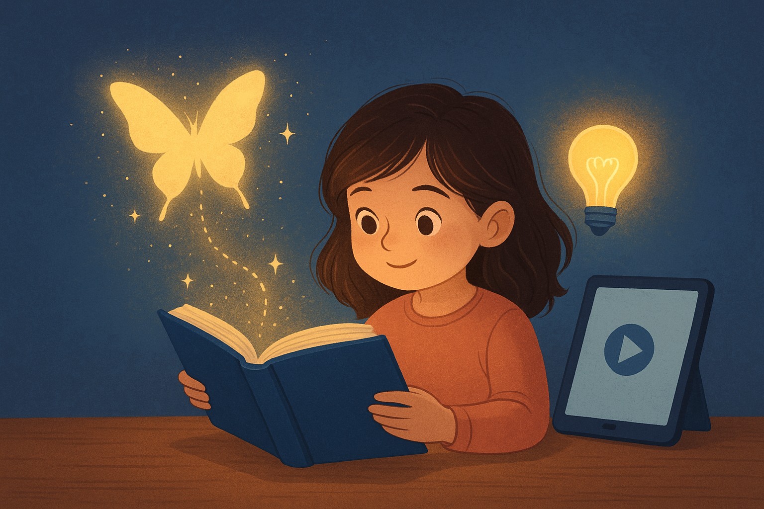 📖 من الجميل أن نُخصّص "زاوية قراءة ذكية" في البيت، حيث يُمكن للطفل أن يجمع بين الكتاب الورقي والجهاز الرقمي في توازنٍ جميل: يقرأ قصة، ثم يستخدم تطبيقًا تعليميًا لاكتشاف معاني الكلمات، أو يلعب لعبةً تُحاكي مغامرات بطل القصة.